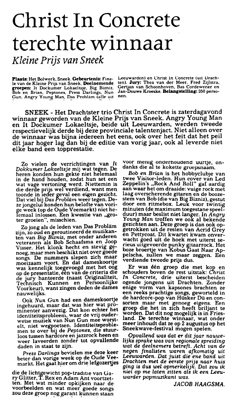 De overwinning tijdens de Kleine Prijs van Sneek 1986 is dan ook een verrassing voor velen, maar de pers is het unaniem met de jury eens. "Christ In Concrete terechte winnaar" kopt de Leeuwarder Courant van 16 juni 1986. De band speelt daarop op het Sneekwave-festival, samen met punkrockbands The Fall en de Ramones. Christ In Concrete heeft een eigen geluid dat het midden houdt tussen donkere fuzzklanken en sterke melodieën. Beïnvloed door Jesus and the Mary Chain en Husker Dü neemt de band twee rauw klinkende platen op bij Sound & Vision, het label Leeuwarder Wobbe van Seijen: Future Men (1986)  en The Raven (1987). Deze platen hebben weinig commercieel succes, en de band stort zich voornamelijk op live-optredens. Zonder drummer Peter Pot, want die verlaat na de opnames van de tweede plaat de band. Met het aantrekken van Jan Pier Brands (destijds van de Stalin Orgels,  tegenwoordig teamleider van de Academie voor Popcultuur en drummer bij Meindert Talma) begint CiC aan het derde album in de Tango Studio te Eindhoven, maar met de opnames wordt niks gedaan. Met de Ierse helden van My Bloody Valentine, met hun rauwe geluid een grote inspiratiebron  sinds het begin, speelt de band in de Brouwershoeck, maar helaas blijken de ambities en muzikale voorkeuren te ver uit elkaar te liggen. In 1990 gaat Christ in Concrete uit elkaar. Als de singer-songwriter Jan Kuipers Alma op 15 april 2007 een cd-presentatie in het Drachtster Karmelklooster geeft, beleeft de band een eenmalige reünie.